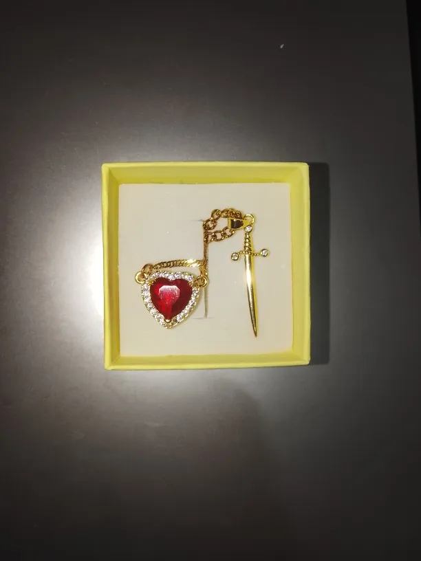 Set de collares para pareja de corazón y espada, fabricados en acero inoxidable con acabado en tono oro y detalles en cristal tipo zirconia.