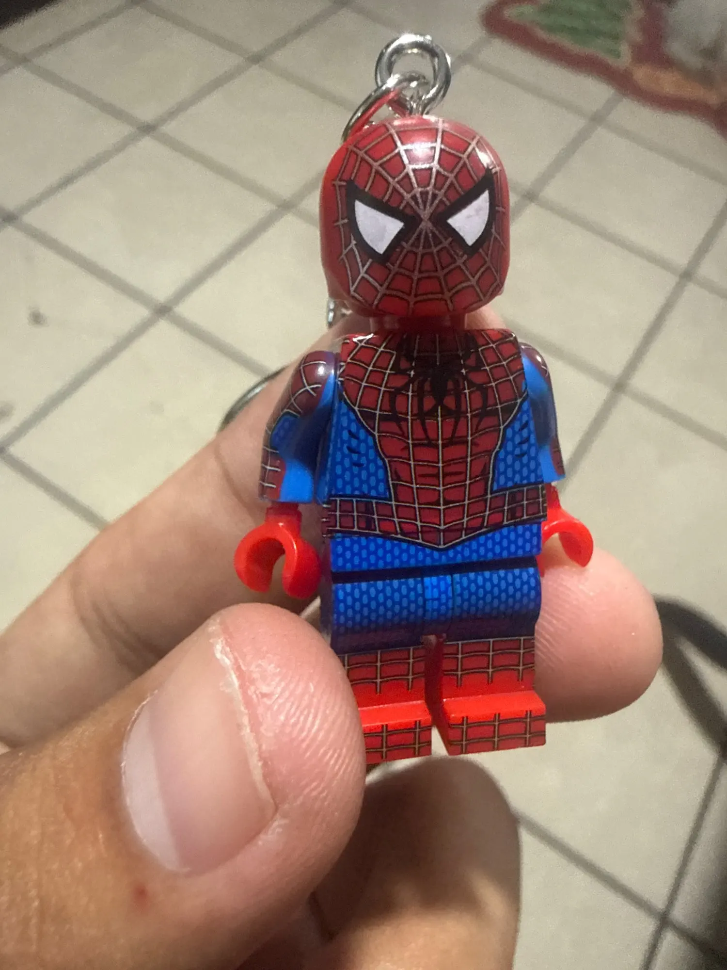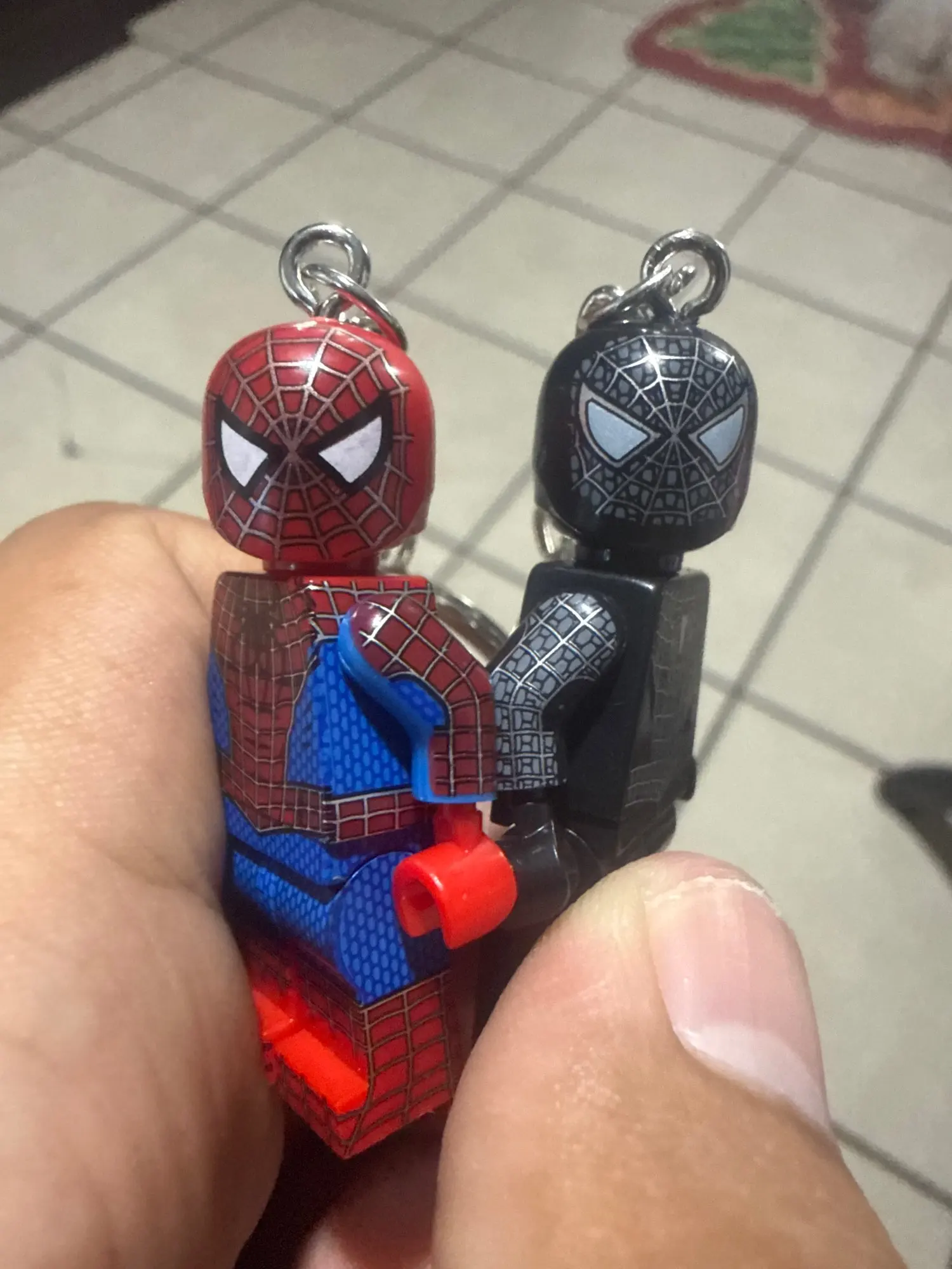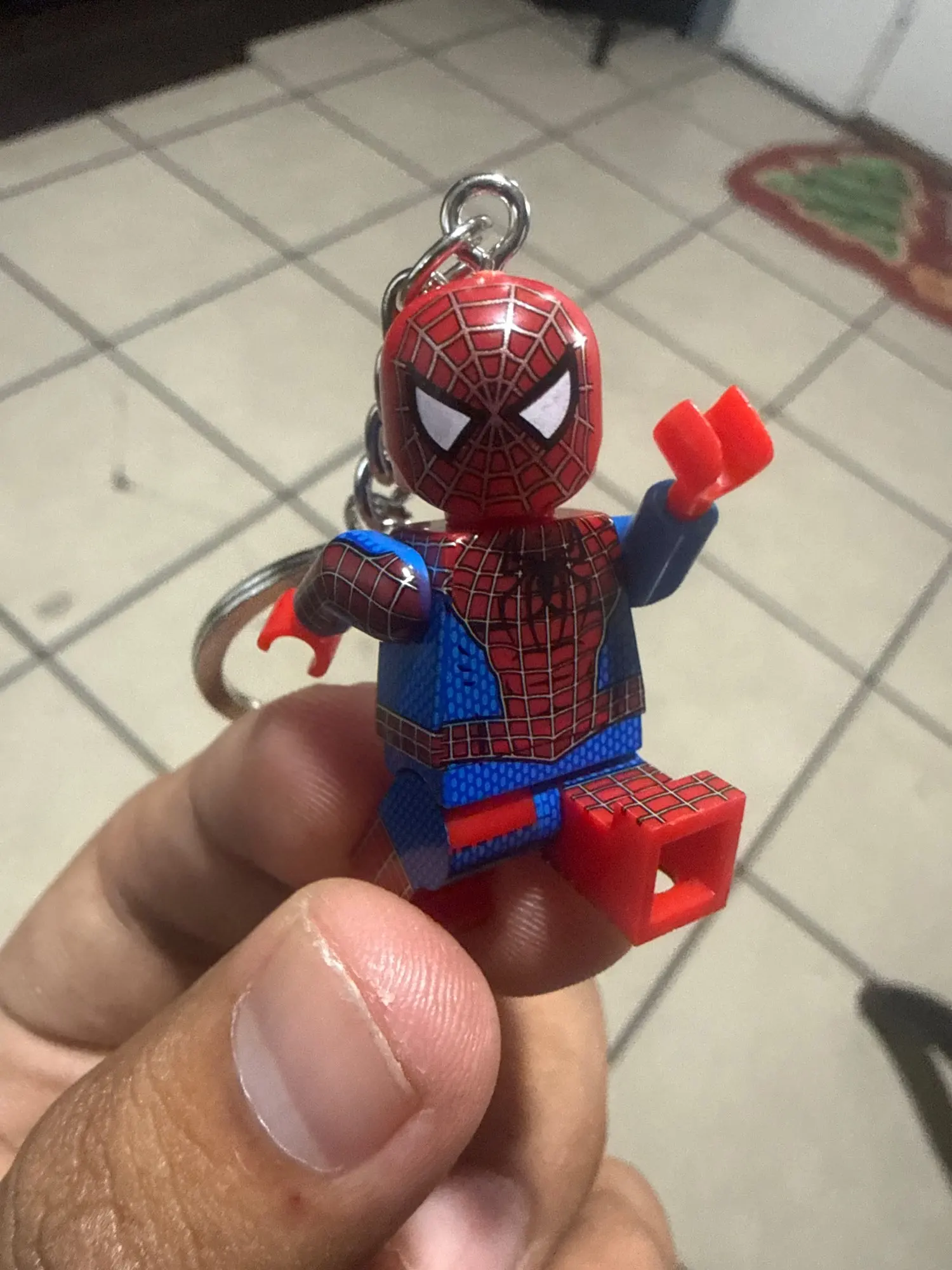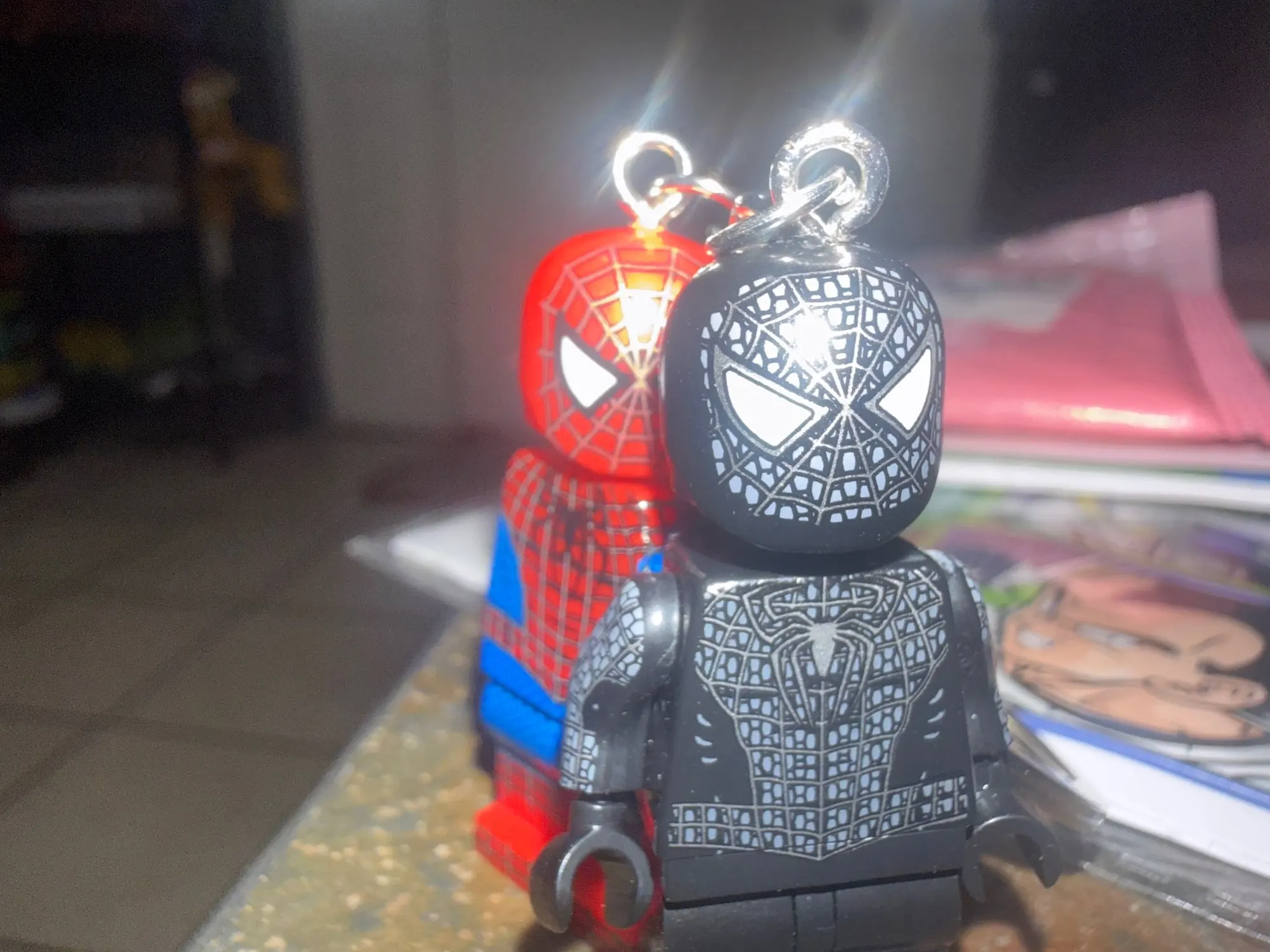 Mini figura tipo bloque inspirada en personajes de Spiderman. Ligero, resistente y perfecta para mochilas escolares, llaves, estuches, etc.